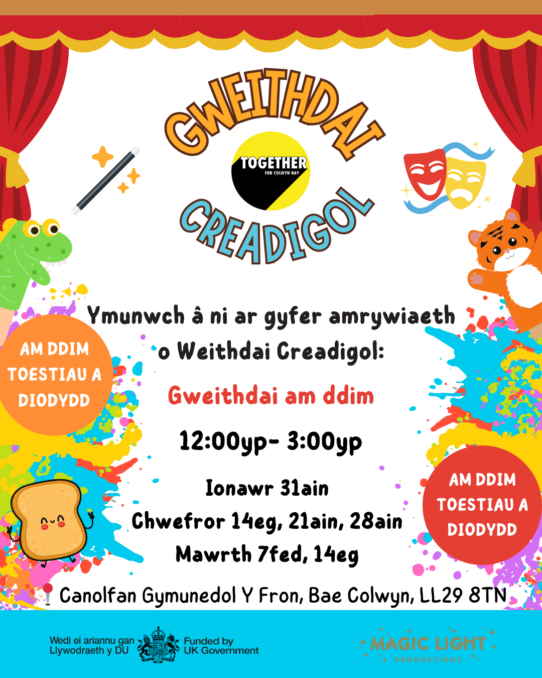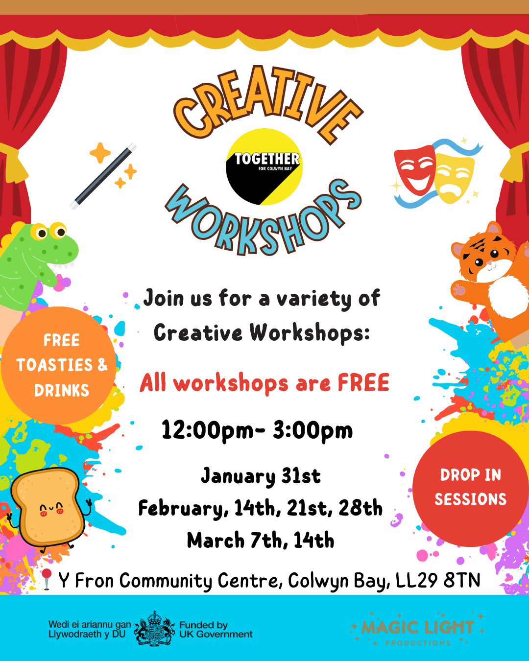 Together for Colwyn Bay are excited to bring you Creative Workshops for all ages, delivered by Magic Light Productions. We offer a range of different sessions full of creativity and fun, with FREE toasties and drinks provided.